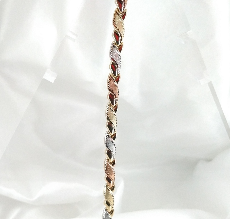 Sárga arany karkötő rózsa és fehér arannyal díszítve.