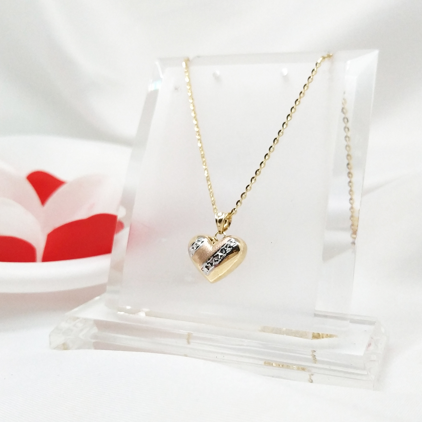 Három színnel és gyémántvéséssel díszített gömbölyített szívmedál.