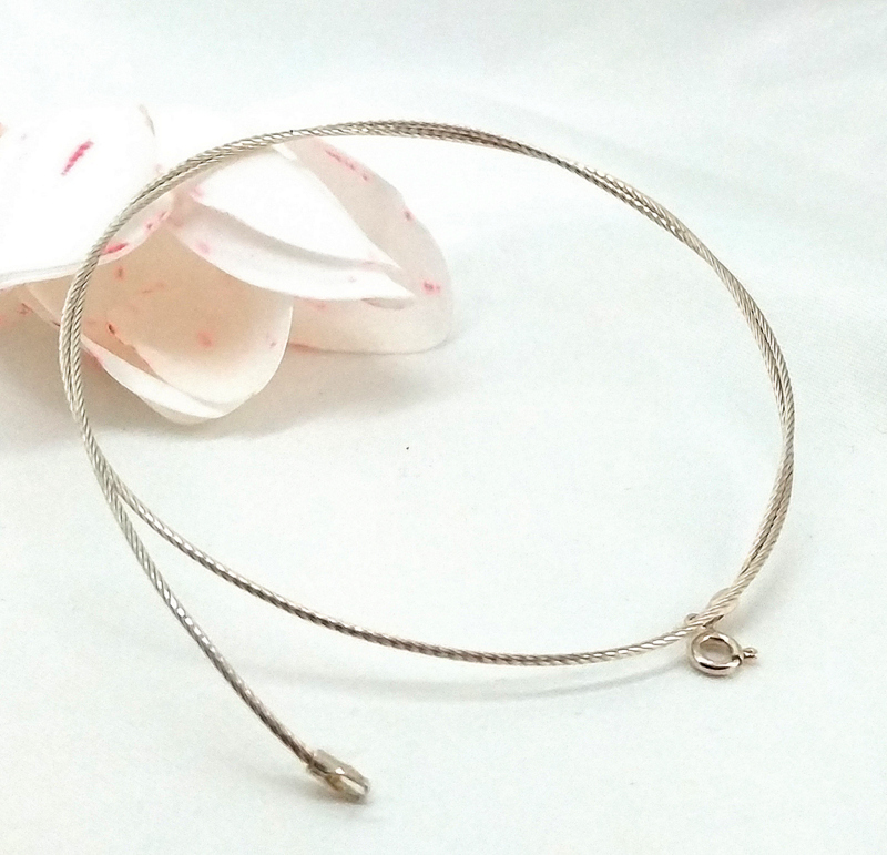 Merev drótszerű nyaklánc. Medál sem húzza le, felvéve is kerek marad.