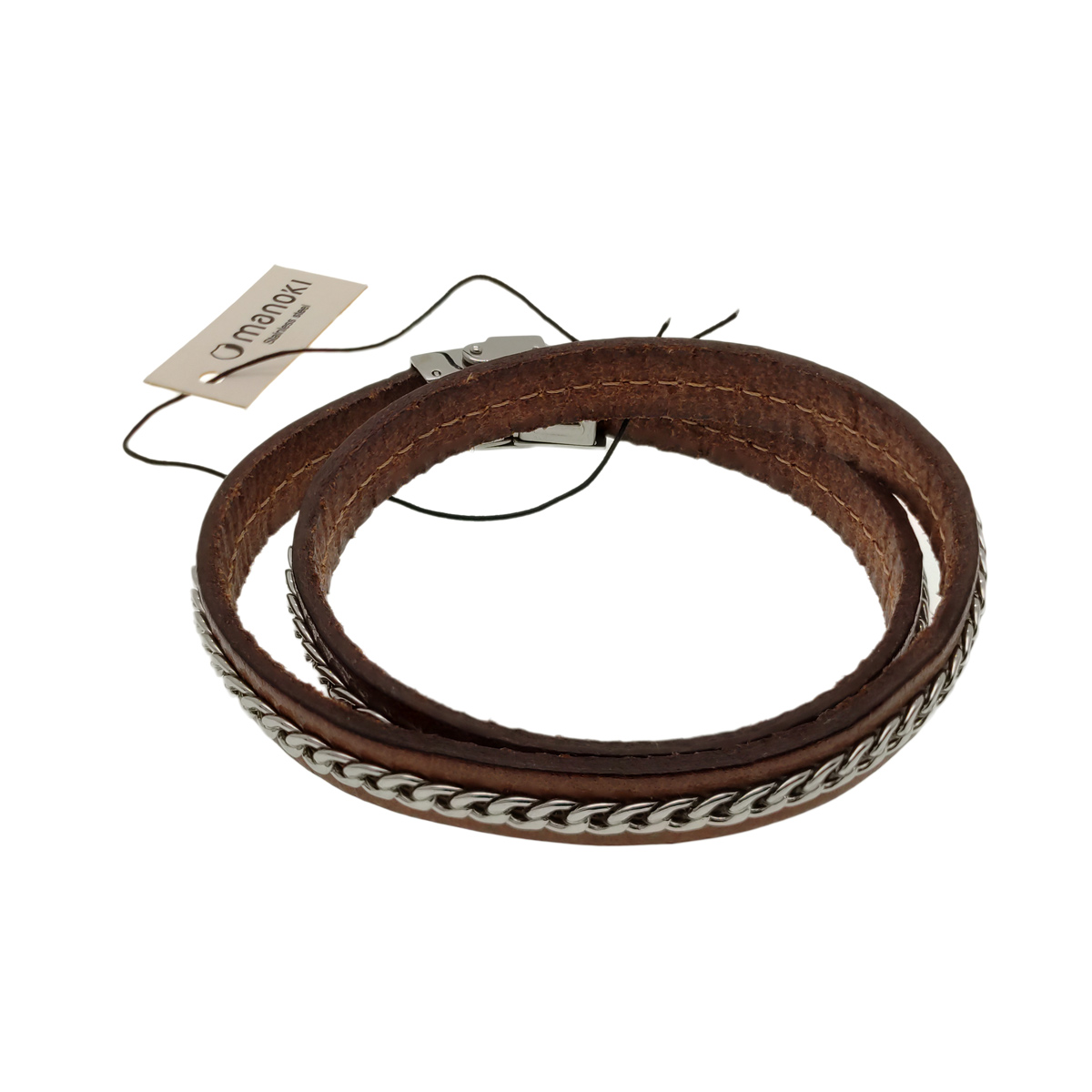 Duplán csuklóra tekerhető barna bőr karkötő. Nemesacélból készült láncmintás sordísszel.