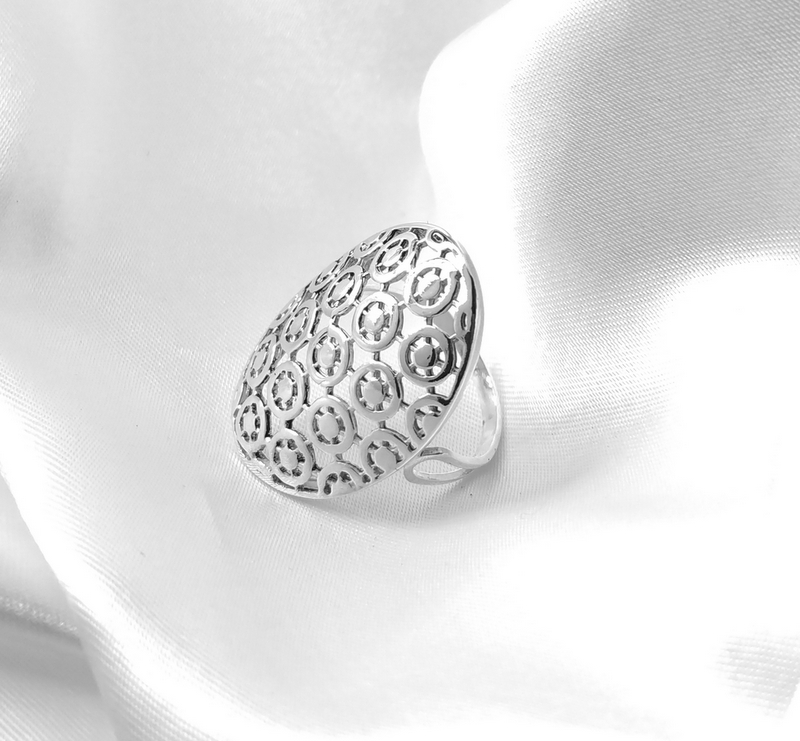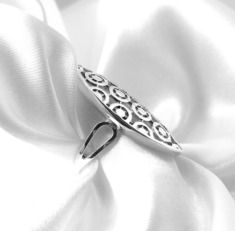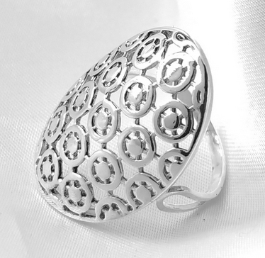 Áttört mintás, ovális fejrészű ezüst gyűrű. Több méretben rendelhető.